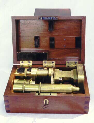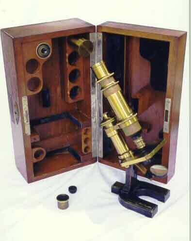 This boxed set was clearly a microscope for someone who had to travel since it broke down into smaller pieces and fit into this small box. The objectives fit into a smaller cardboard box with fit into a smaller storage area at the right under the foot of the microscope. This particular stand was manufactured in 1890 and has two serial numbers (747/1514). The first noted that it was the 747th compound microscope of 1514 microscopes made in the Zeiss workshop. Note the ivory keyhole located on the outside of the box. This was to enable the user to open and close it in subdued light since at this time they were 20 or more years from having available electricity in the workshop or the laboratory |