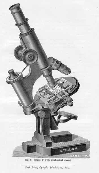 This illustration shows the Ia stand from 1889. This was the year after the death of Carl Zeiss and the same year that Abbe announced new apochromatic objectives which were totally color corrected. These were possible due to the efforts of Otto Schott who had reacted to Abbe's public statements that current glass technology would not permit such an improvement. Schott has sent glass samples that were better but not right for Abbe's purposes. Schott relocated to Jena and after a lot of discussion between the partners Zeiss and Abbe and a subsidy from the Prussian government, a glass factory was constructed and Schott produced what Abbe was looking for. In fact, Schott revolutionized the glass industry and the the partnership was extremely successful. Abbe was able to open the product line to photographic lenses, telescopes, binoculars, surveying instruments, spectacles and Zeiss would grow from 300 employees in 1888 to over a thousand in 1900 and the growth would be more spectacular in the following years. On close inspection, this stand will show the growing sophistication of every element of the microscope under Abbe.